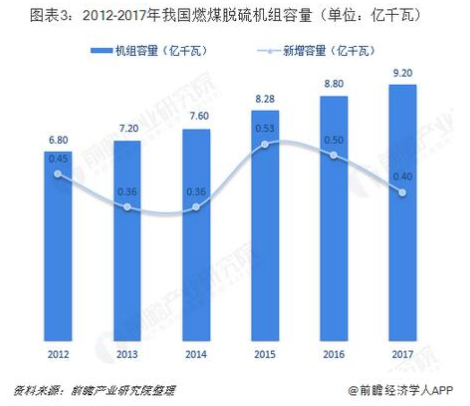 根據(jù)中電聯(lián)數(shù)據(jù),截至2017年底,全國已投運(yùn)燃煤脫硫機(jī)組容量約9.2億千瓦,占全國火電機(jī)組容量的83.6%,占全國煤電機(jī)組容量的93.9%。如果考慮具有脫硫作用的循環(huán)流化床鍋爐,全國脫硫機(jī)組占煤電機(jī)組比例接近100%。