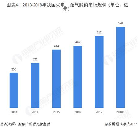 脫硝市場(chǎng)方面,我國氮氧化物的排放量中70%來自于煤炭的直接燃燒,電力工業(yè)又是我國的燃煤大戶,因此火力發(fā)電廠是氮氧化物排放的主要來源之一。2013-2017年,我國已投運(yùn)火電廠煙氣脫硝機(jī)組容量呈上升趨勢(shì)。2017年煙氣脫硝機(jī)組容量達(dá)到9.6億千瓦,同比增長5.5%,增速回落1.6個(gè)百分點(diǎn),預(yù)計(jì)2018年煙氣脫硝機(jī)組容量將達(dá)12億千瓦。 根據(jù)近年來我國國內(nèi)火電脫硝機(jī)組裝機(jī)容量及裝機(jī)單價(jià)計(jì)算,2013年我國火電脫硝市場(chǎng)規(guī)模約為250億元,2017年市場(chǎng)規(guī)模為512億元,預(yù)計(jì)2018年將達(dá)578億元。