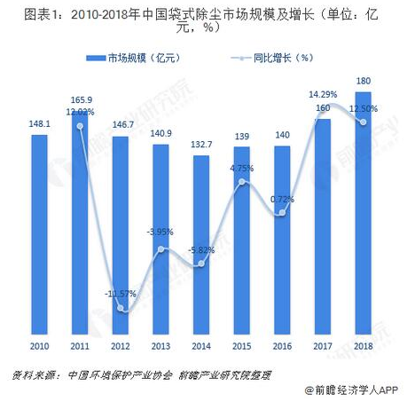 2018年大氣污染治理行業(yè)市場(chǎng)規(guī)模與發(fā)展前景分析 政策趨嚴(yán)刺激需求增加目前,我國大氣污染治理行業(yè)主要由除塵市場(chǎng)、脫硫市場(chǎng)、脫硝市場(chǎng)等組成,近年來在市場(chǎng)需求推動(dòng)下,各細(xì)分市場(chǎng)規(guī)模均有顯著提升。 具體來看,在除塵市場(chǎng)方面,隨著國家對(duì)環(huán)保要求提高,電除塵器、袋式除塵器和電布袋除塵器已經(jīng)成為治理大氣污染的高效除塵設(shè)備,除塵治理取得了良好的成效,工業(yè)煙塵和工業(yè)粉塵排放達(dá)標(biāo)率均逐年提高,工業(yè)煙塵和工業(yè)粉塵去除量逐年增長。 從市場(chǎng)規(guī)模來看,以袋式除塵為例,根據(jù)中國環(huán)境保護(hù)產(chǎn)業(yè)協(xié)會(huì)數(shù)據(jù)統(tǒng)計(jì),2014年以來,我國袋式除塵器市場(chǎng)規(guī)模重新恢復(fù)增長,到2018年行業(yè)總產(chǎn)值預(yù)計(jì)約180億元,總產(chǎn)值增長率12.50%。