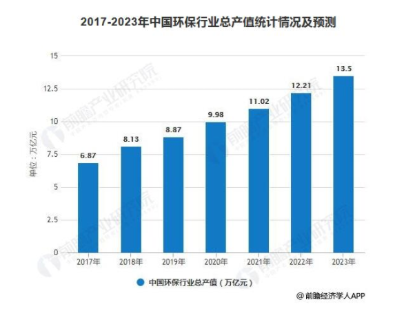 2019年中國環(huán)保行業(yè)市場現(xiàn)狀及發(fā)展趨勢分析 PPP模式加快助力產(chǎn)業(yè)轉(zhuǎn)型發(fā)展國內(nèi)的環(huán)保產(chǎn)業(yè)已經(jīng)邁入2019年,縱觀環(huán)保產(chǎn)業(yè)的發(fā)展,2019無疑是一個(gè)全新的局面,水土固廢氣的大監(jiān)管格局已形成。新的格局下,環(huán)保產(chǎn)業(yè)已從政策播種時(shí)代進(jìn)入到全面的政策深耕時(shí)代。 未來中國環(huán)保行業(yè)總產(chǎn)值將達(dá)14萬億 據(jù)前瞻產(chǎn)業(yè)研究院發(fā)布的《中國環(huán)保行業(yè)發(fā)展前景與投資預(yù)測分析報(bào)告》統(tǒng)計(jì)數(shù)據(jù)顯示,截止至2017年中國環(huán)保行業(yè)總產(chǎn)值達(dá)到6.87萬億元,前瞻初步測算2018年中國環(huán)保行業(yè)總產(chǎn)值將達(dá)8.13萬億元左右。預(yù)測2019年中國環(huán)保行業(yè)總產(chǎn)值將達(dá)8.87萬億元。未來五年(2019-2023)年均復(fù)合增長率約為11.07%,并預(yù)測在2023年中國環(huán)保行業(yè)總產(chǎn)值將接近14萬億元。